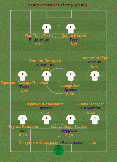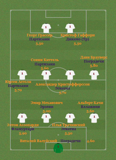 тура: Пак Чунь Хван (Нафтетари) и Майкл Нордиелло (Шкумбини) - 3 гола Диспетчер тура: Владимир Нагибин (Нафтетари) - 3 передачи Гол+пас: Пак Чунь Хван и Владимир Нагибин (оба Нафтетари) и Майкл Нордиелло (Шкумбини) - 3 очка